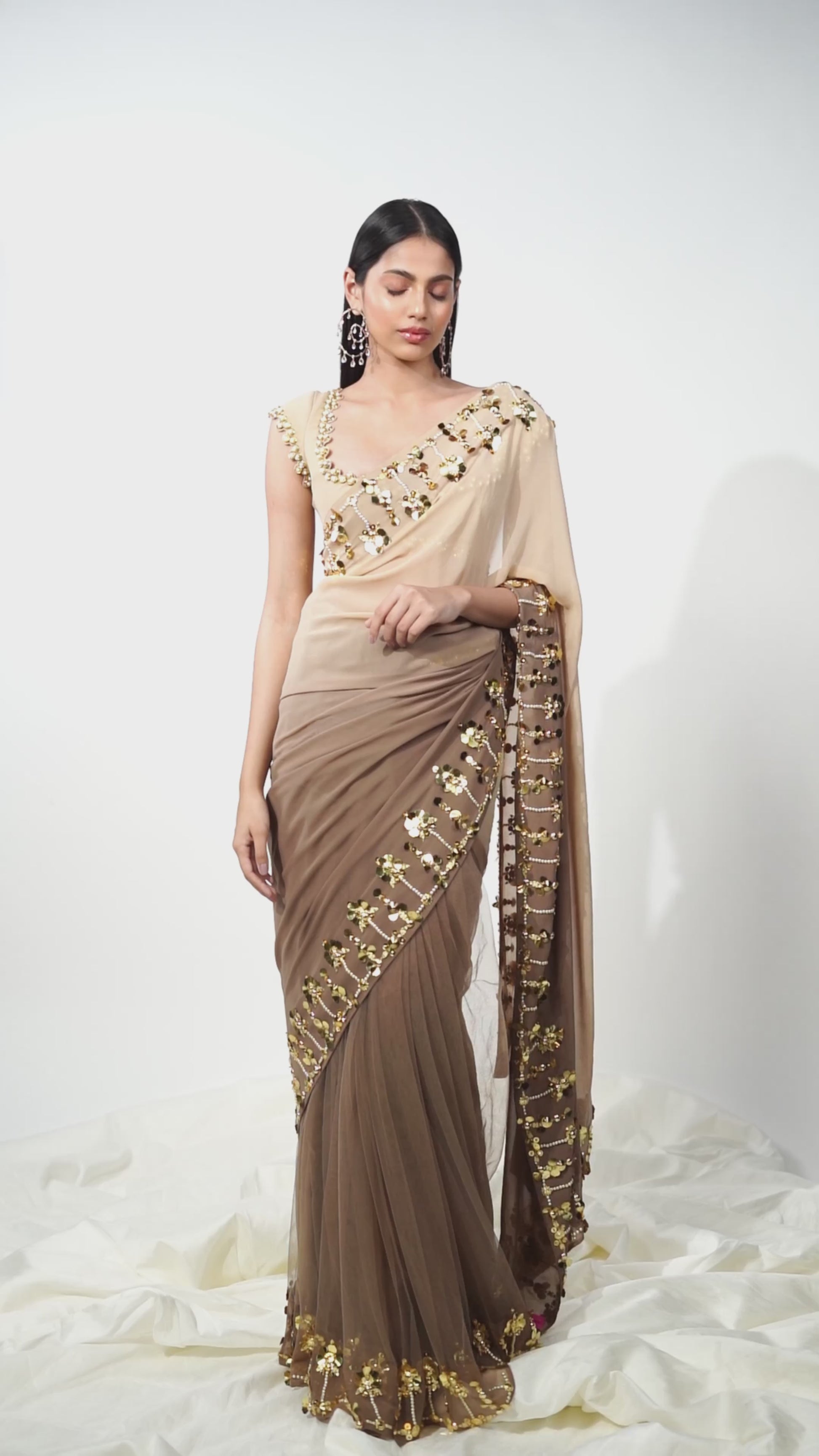 Introducing our brown-taupe ombre saree, enhanced by a richly embroidered border in gold, adorned with pearls, acrylics, and metallic accents. Completing the ensemble is a taupe cutwork blouse, elegantly detailed with a gold embroidered border featuring rings and pearls.