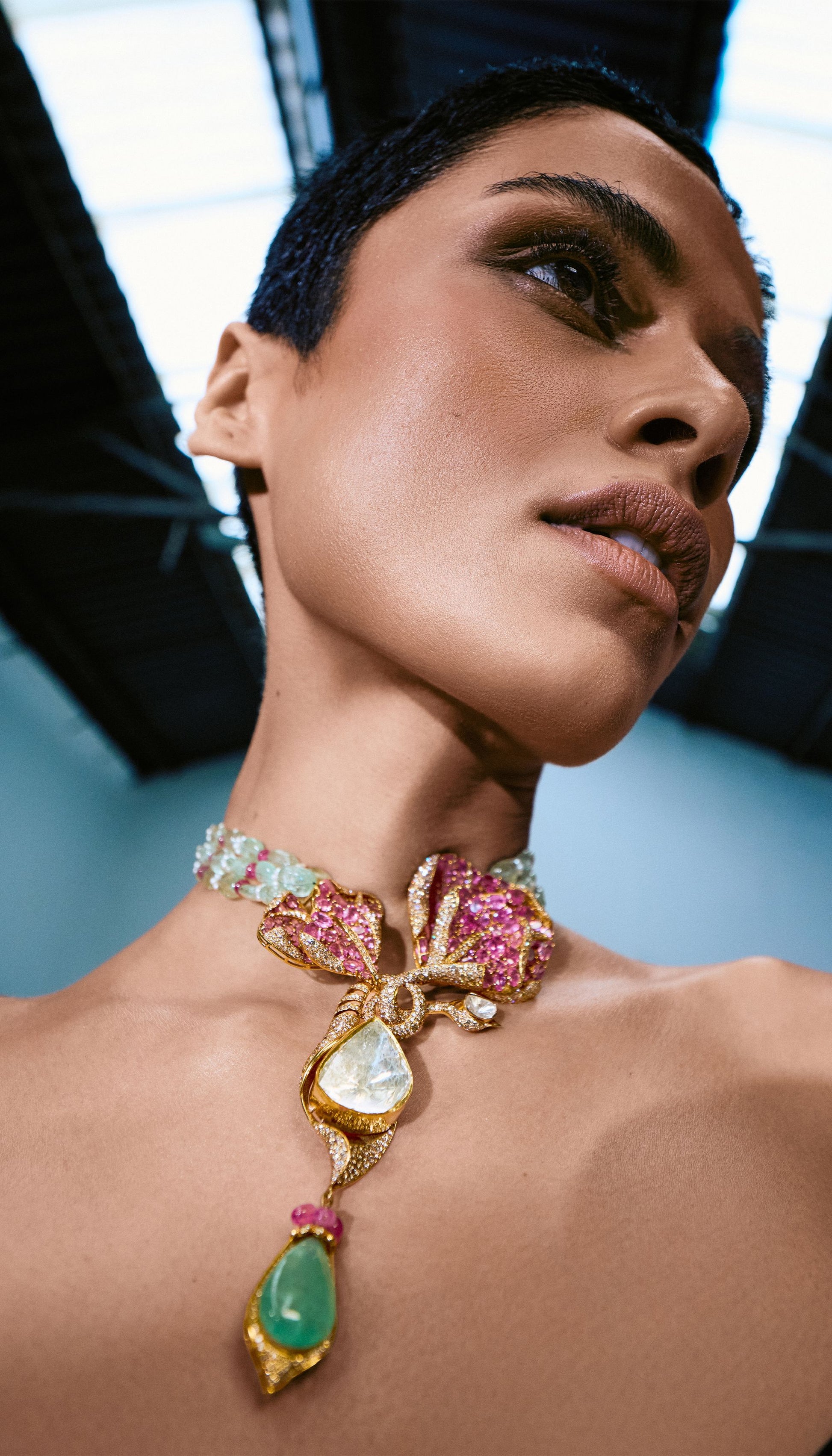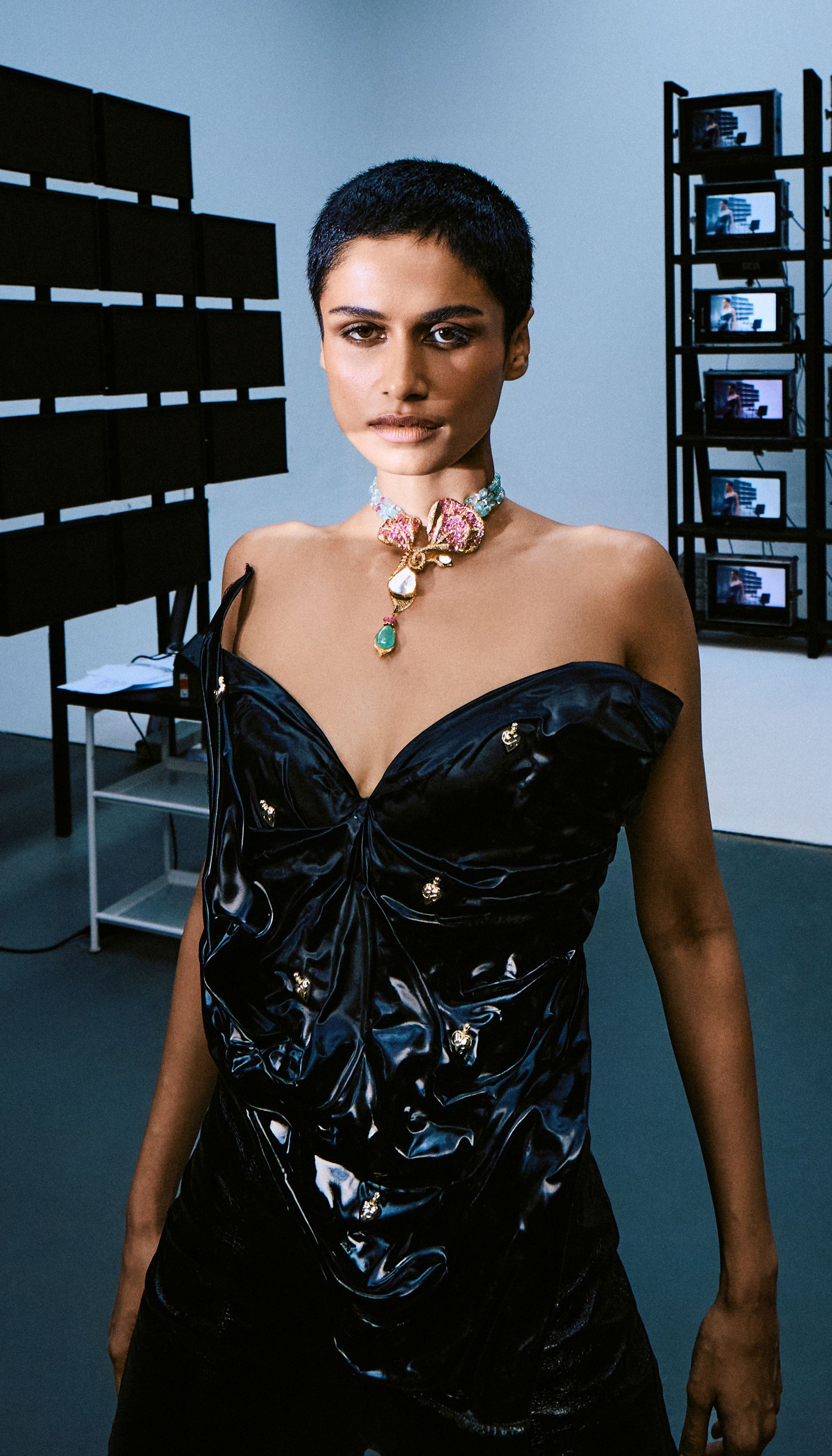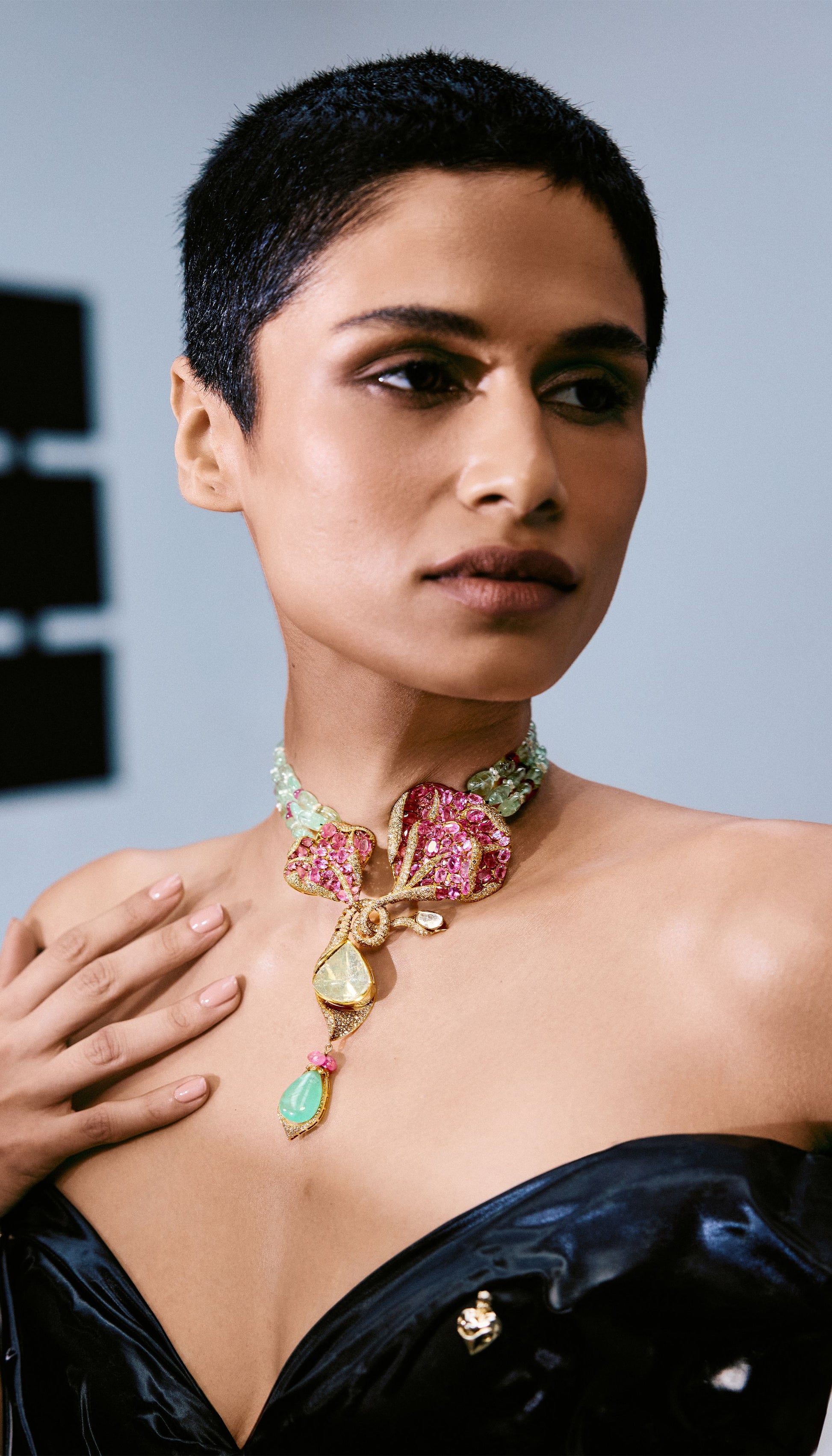 Handcrafted in 18-karat gold, this necklace draws the eye to its centre -a striking 4-carat Polki, luminous and commanding. From there, the design unfurls with rare natural Russian emeralds strung as the pirohii of the necklace, their richness lending both colour and weight to the composition. The jewel finds its crescendo in a Russian Emerald drop, suspended with grace, completing the piece with a note of depth and resonance.