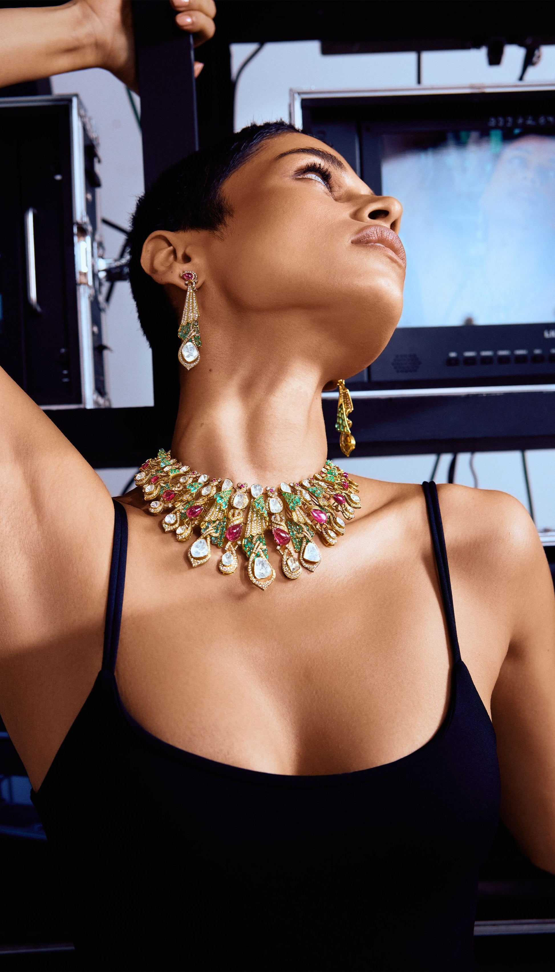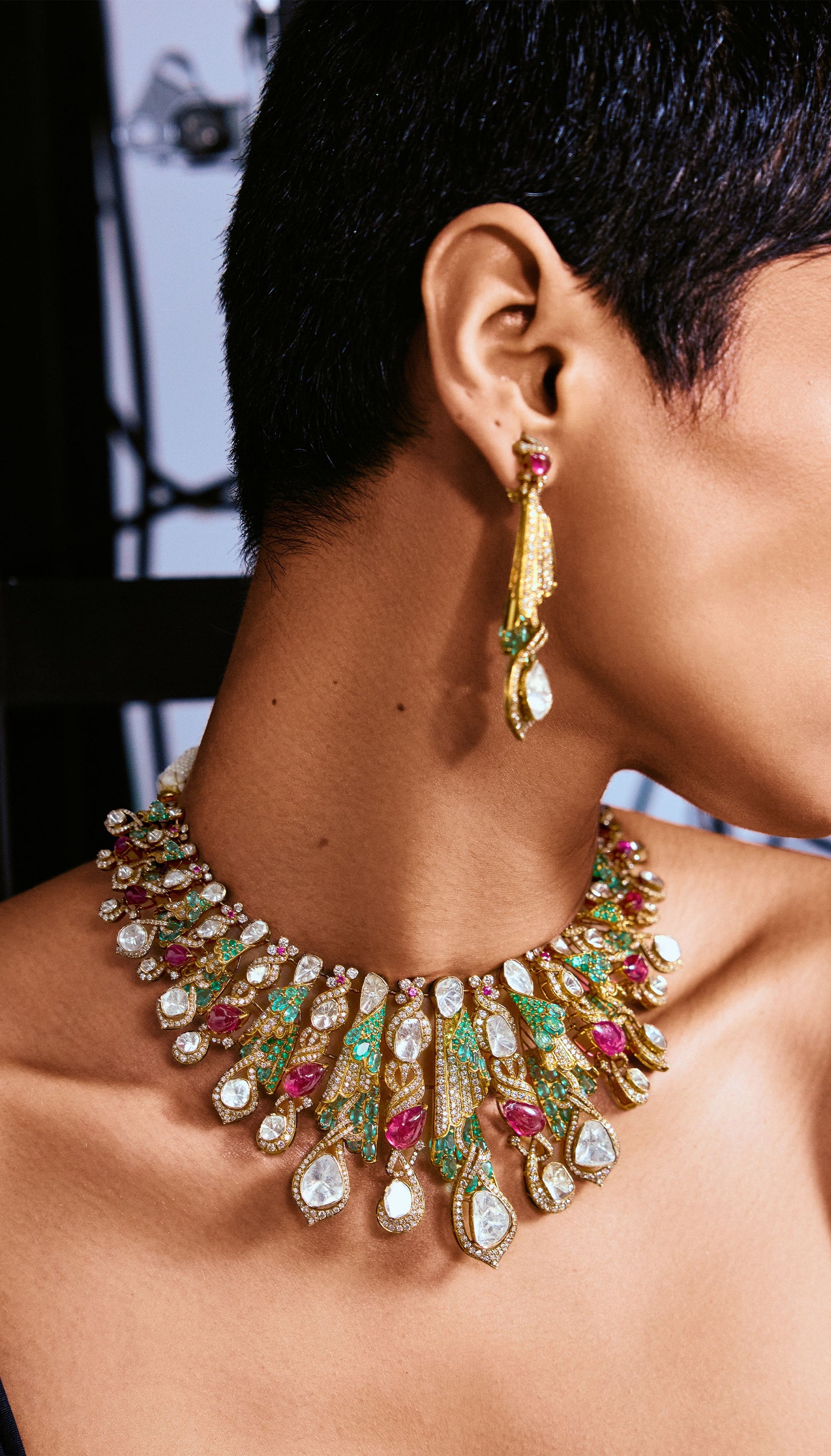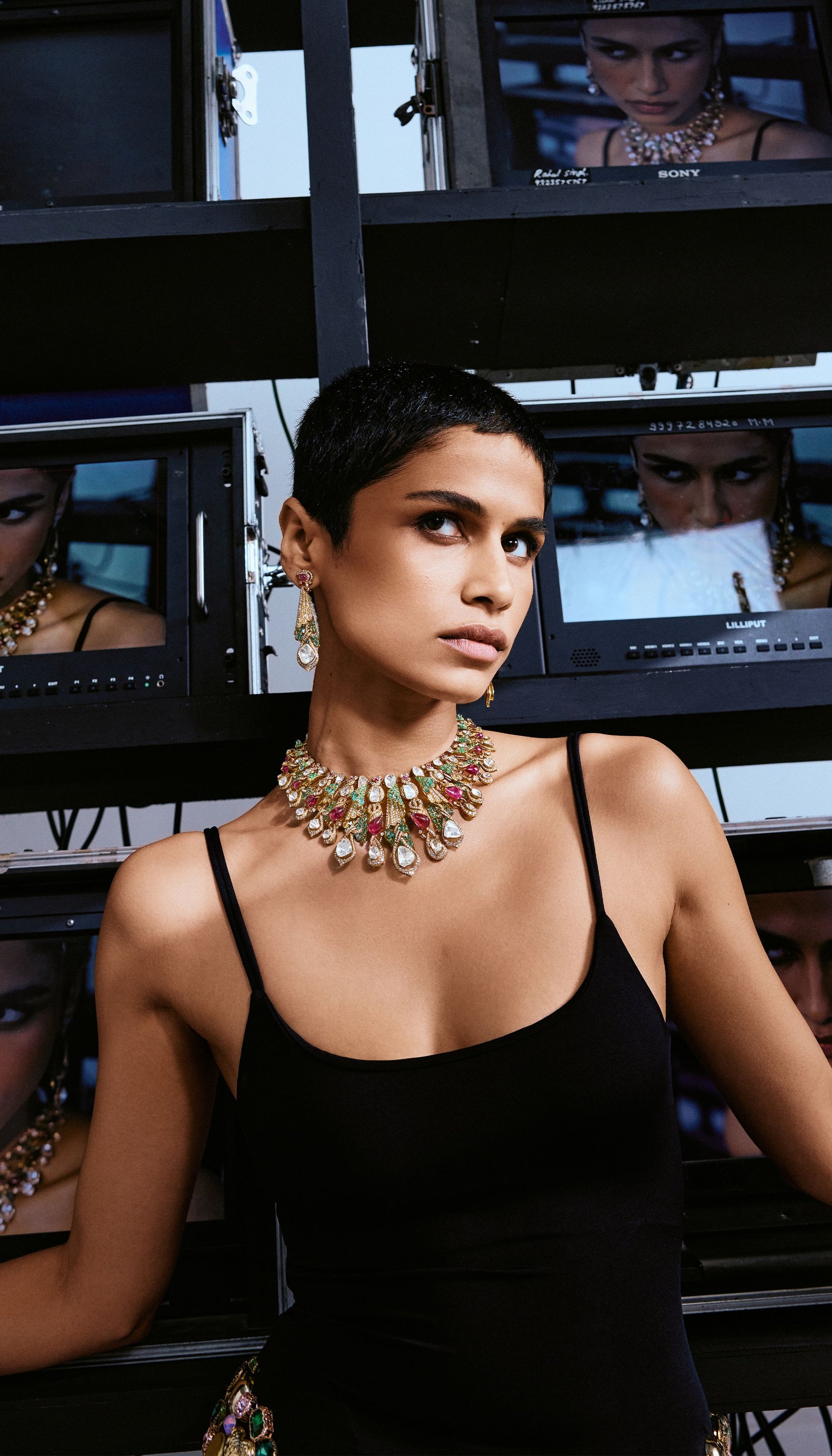 This set unfurls as a modern ode to grandeur. Natural Zambian emeralds and smooth tourmaline cabochons punctuate its expanse, their saturated hues playing against the cool clarity of Polki in varied cuts. Each uncut diamond holds its own, whether as teardrop, oval, or shard, together forming a mosaic.Along the edges, pavé-set diamonds glimmer like a halo, binding the composition in quiet brilliance.