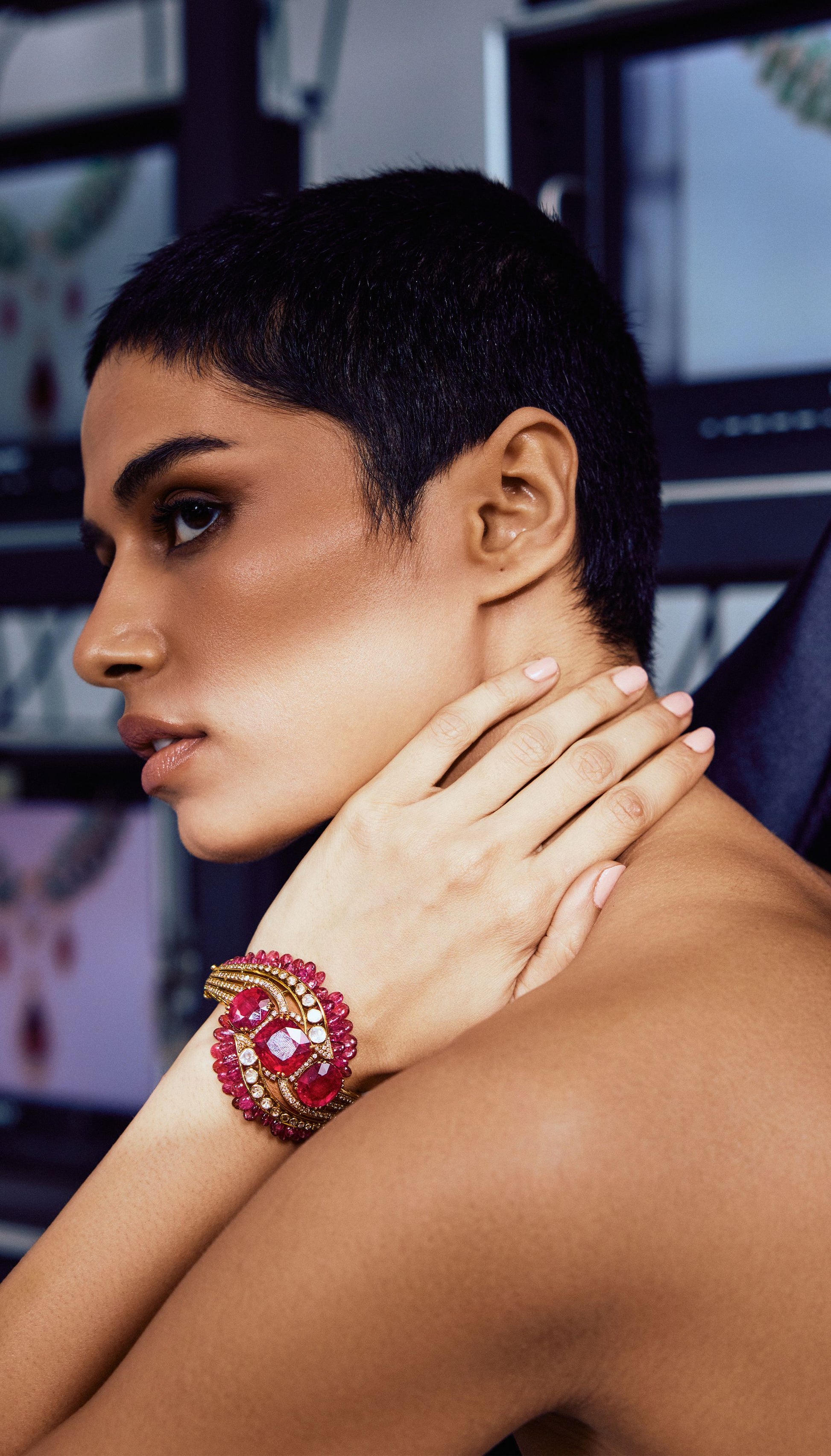At its centre, a cushion-cut rubellite glows with regal intensity - a stone long cherished in Indian tradition for its depth and vitality. The tri-stone setting lends balance and symmetry, while strands of natural rubellite beads accentuate the bracelet’s sculptural curve, amplifying both form and color.