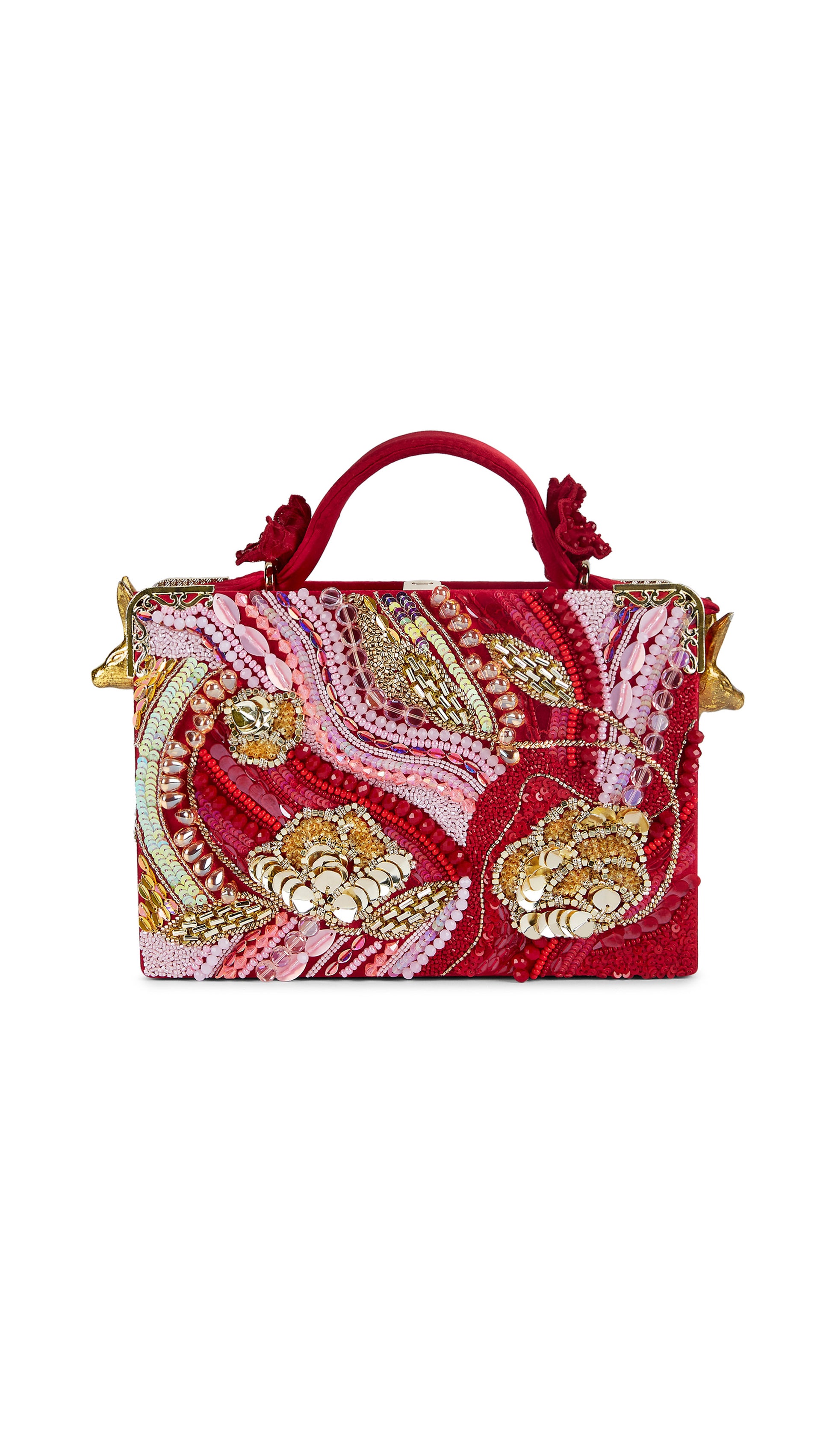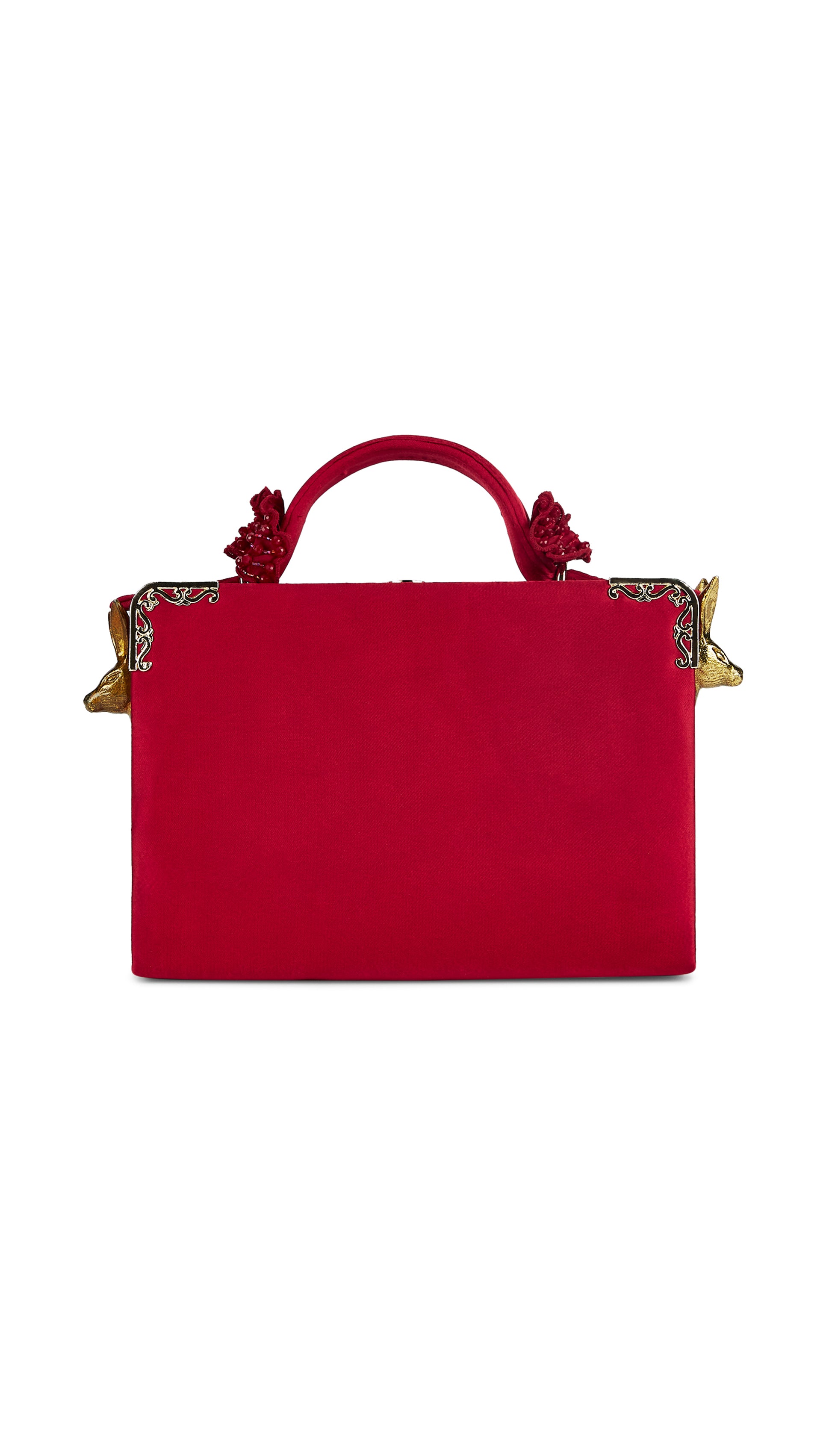 Structured like a storybook, built like a treasure case — it’s the kind of piece that holds more than belongings, it holds beginnings. Draped in red satin, its surface blooms with golden roses stitched and red and pink crystals encrusted, colour long tied to love, devotion, and the bridal spirit. Along its sides, brass bunnies add a touch of whimsy, like guardians watching over what’s most precious.