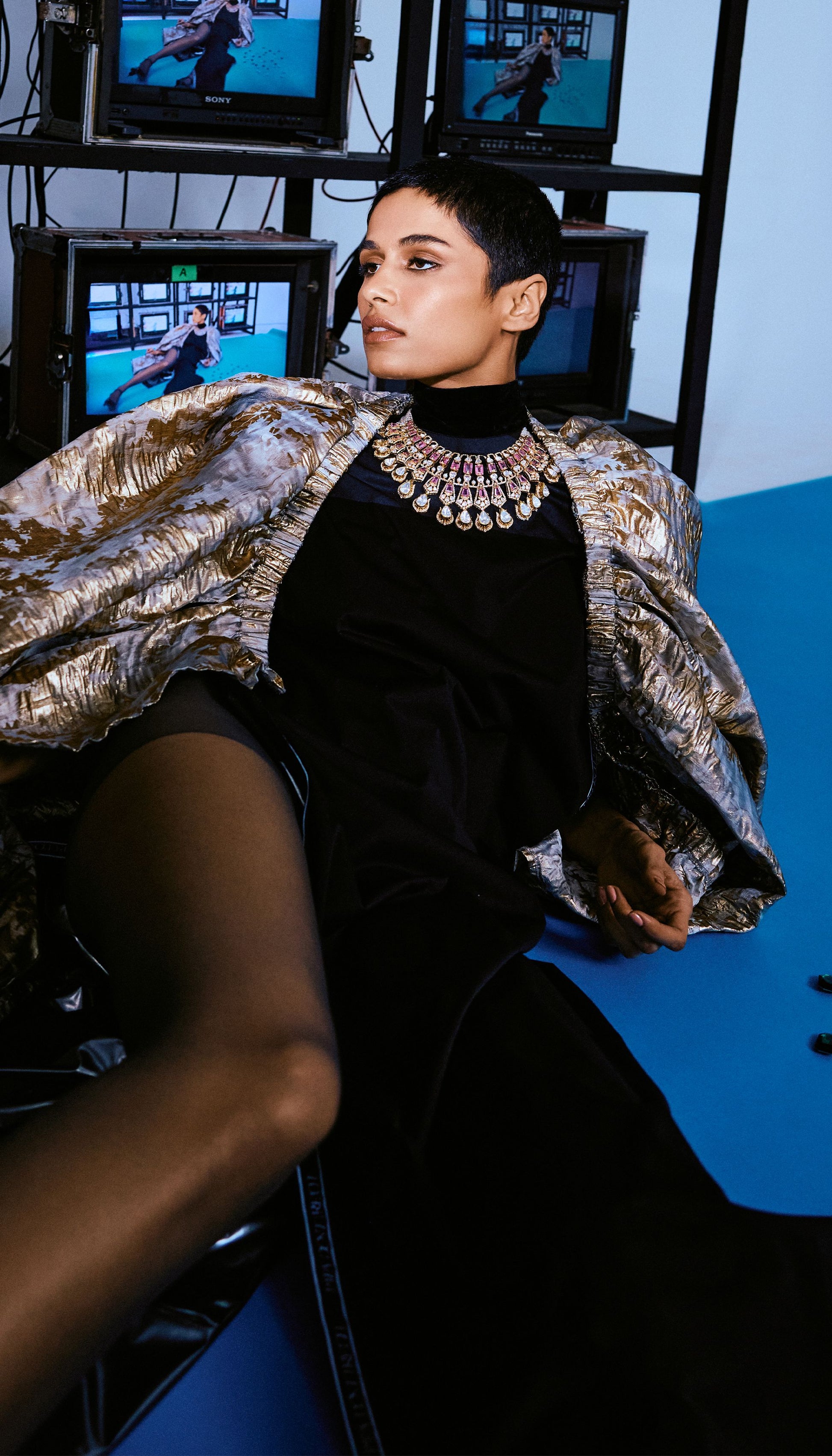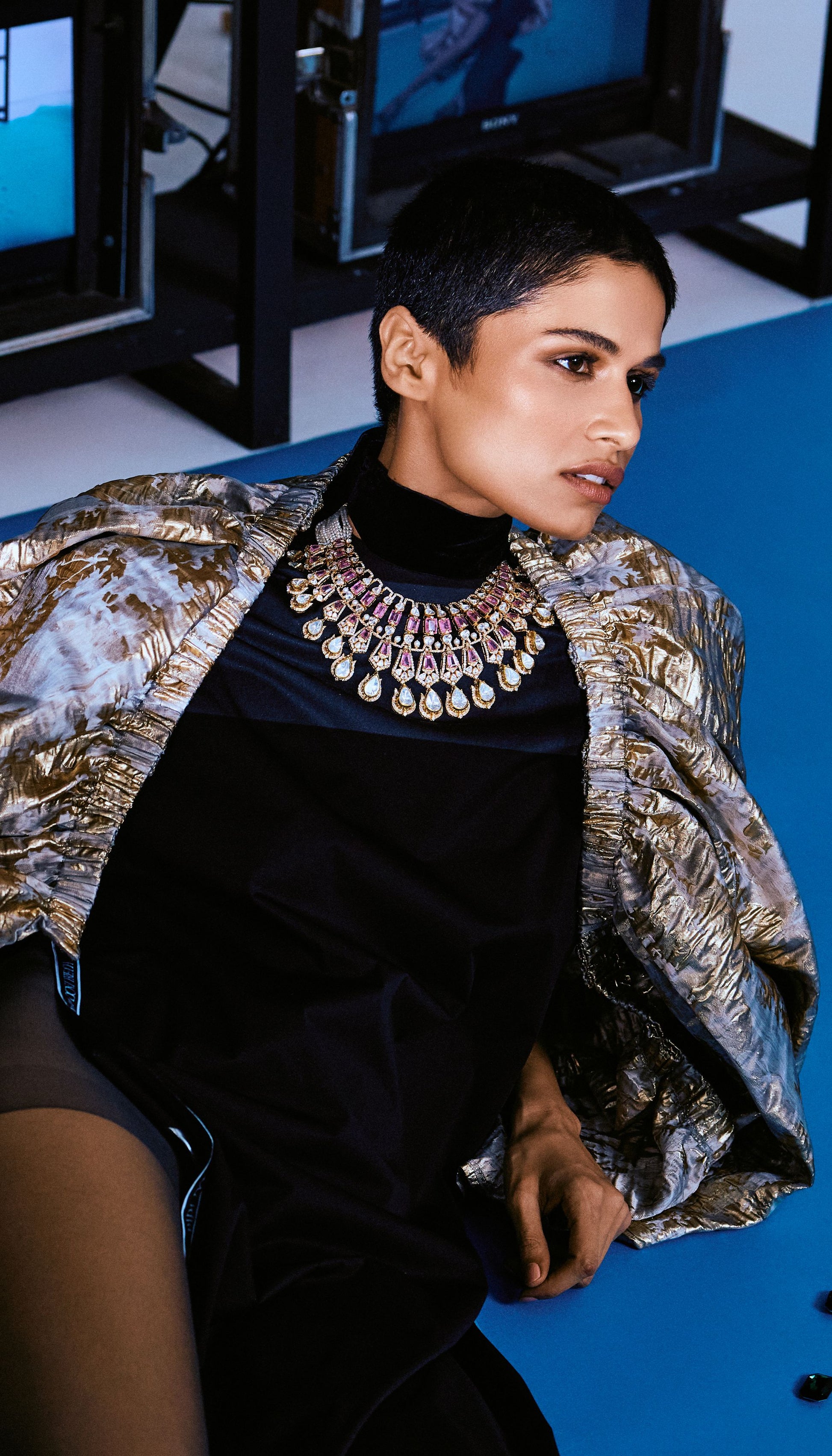 Handcrafted in 18-karat gold, this necklace rises like a coronet at the collar, where 23 carats of Polki and diamonds ignite in cascading brilliance. Each setting is alive with colour -tourmalines in blush tones and Zambian emeralds of striking depth - their rhythm unfolding in perfect symmetry.