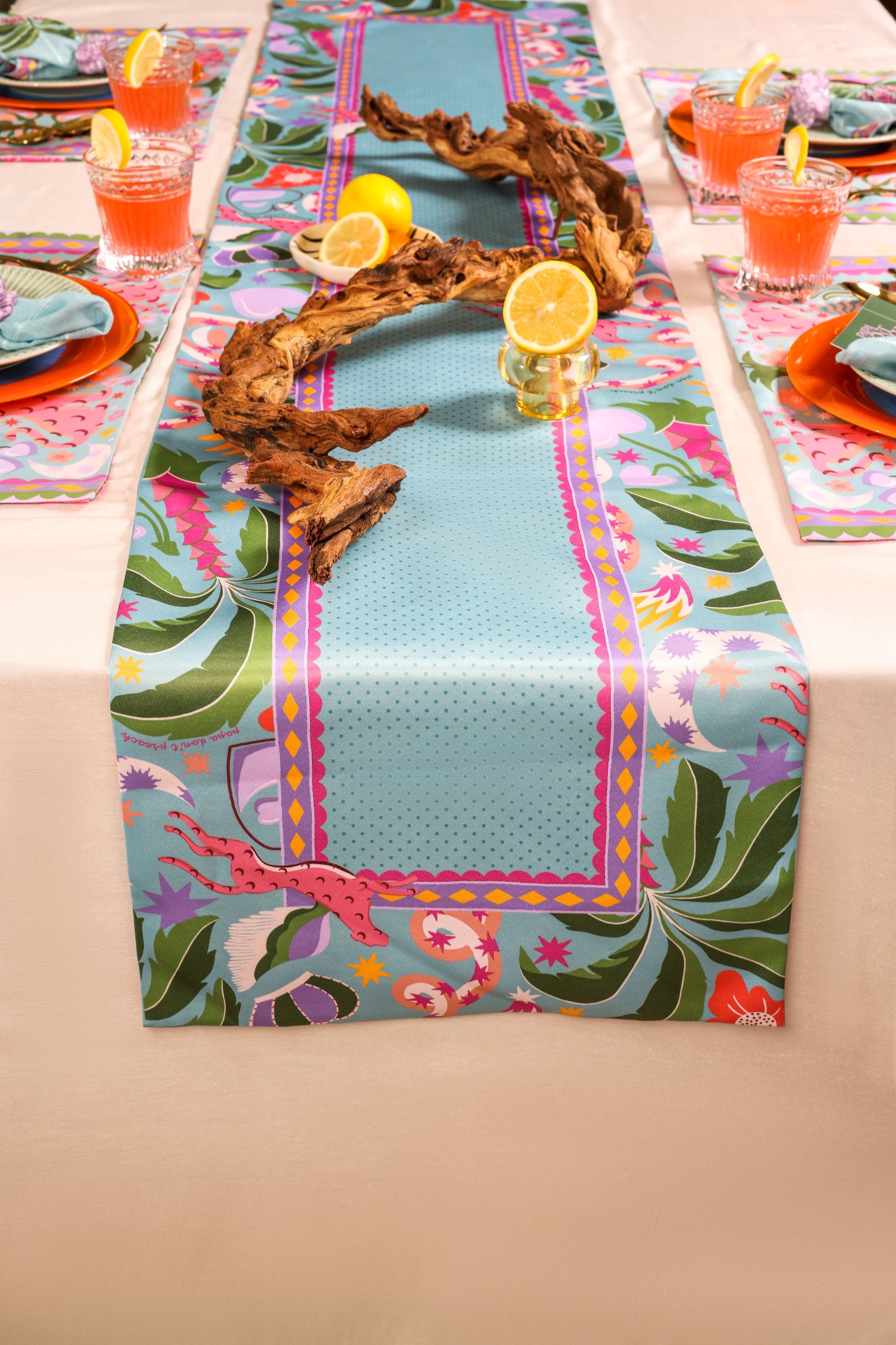Vibrant tropical floral with whimsical accents.Premium quality table runner perfect for hosting.