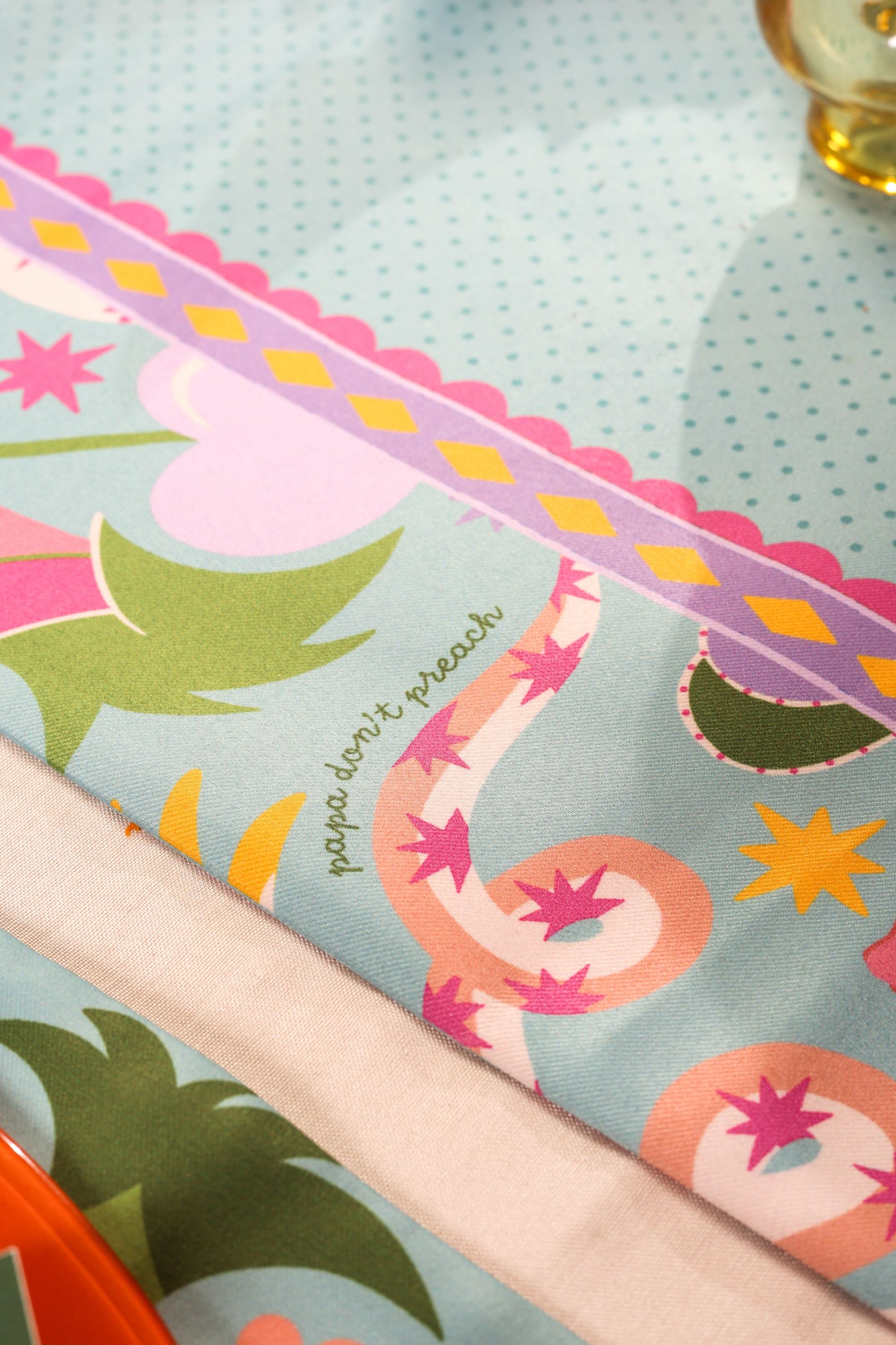 This vibrant teal satin table runner features a tropical, maximalist floral border with cheetahs adding a playful touch.