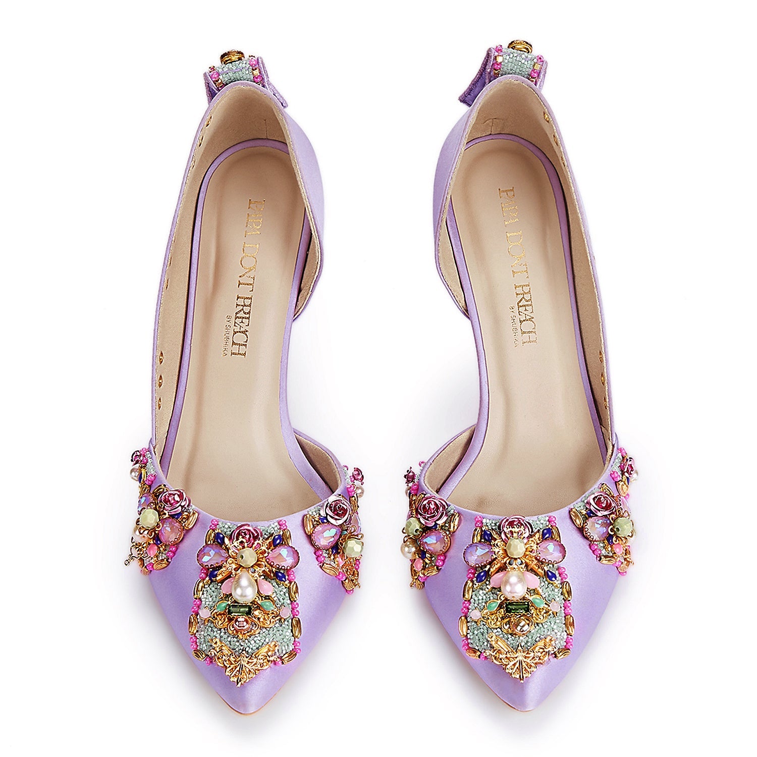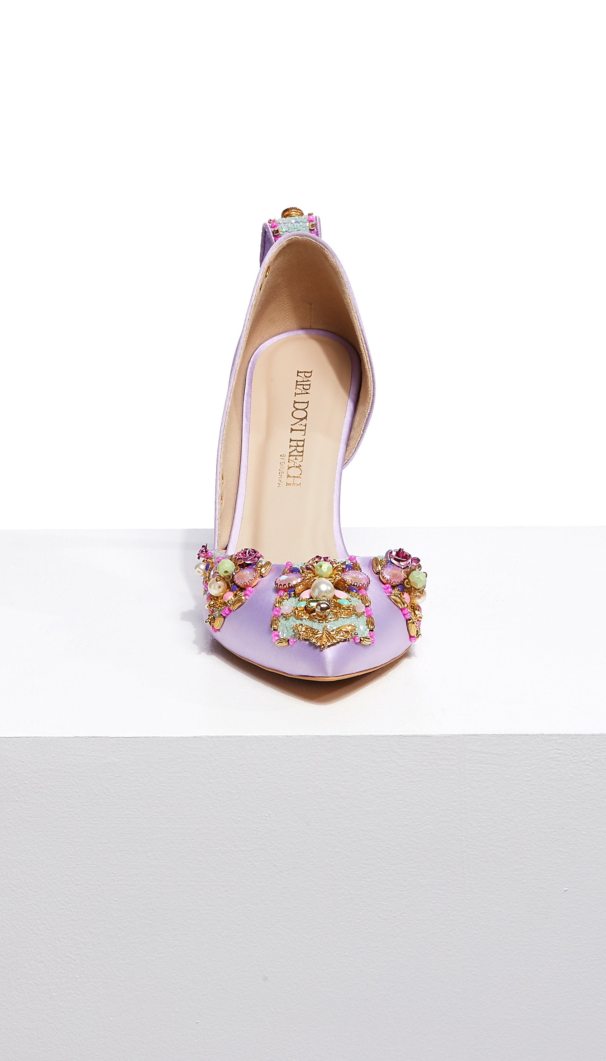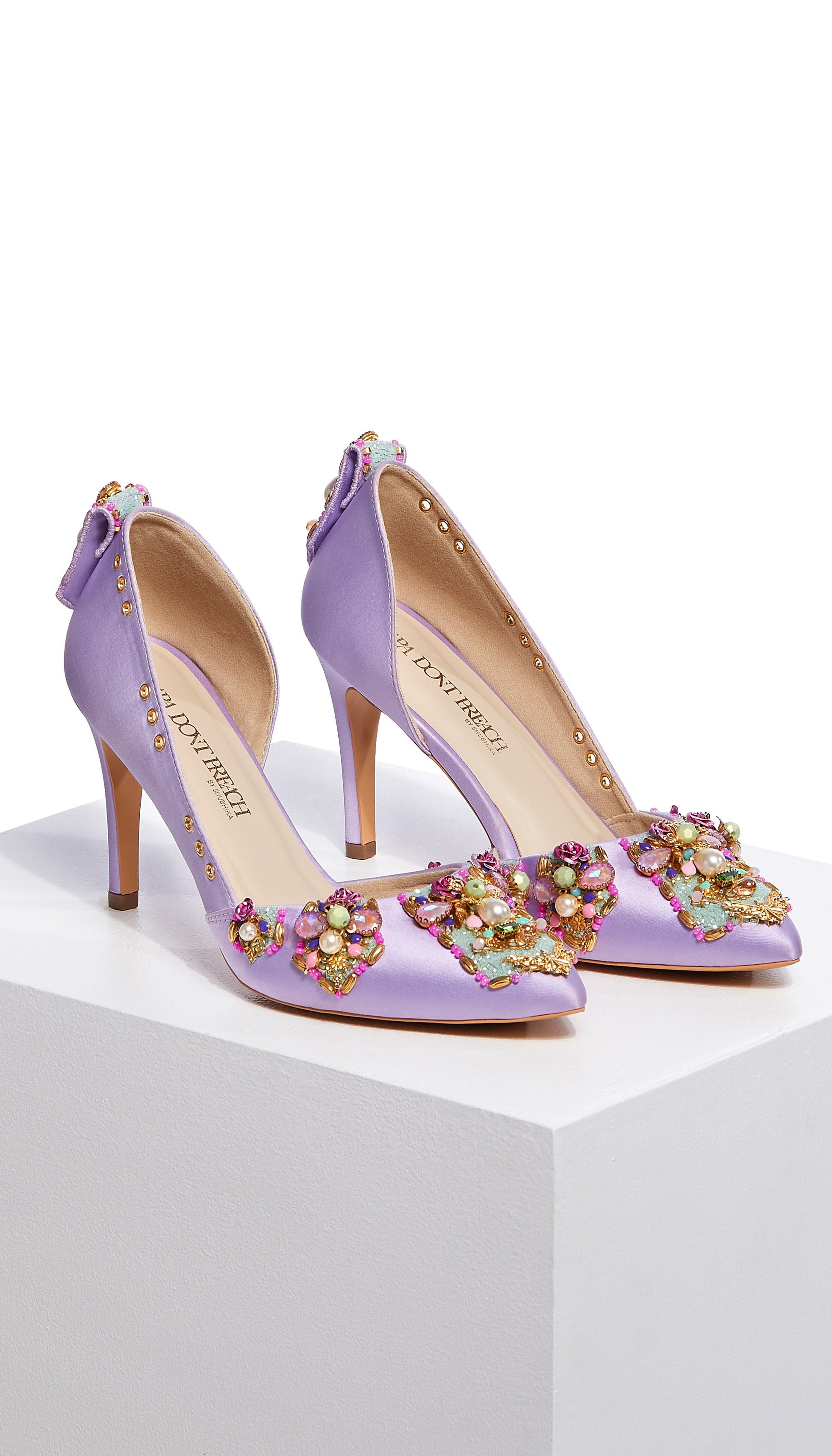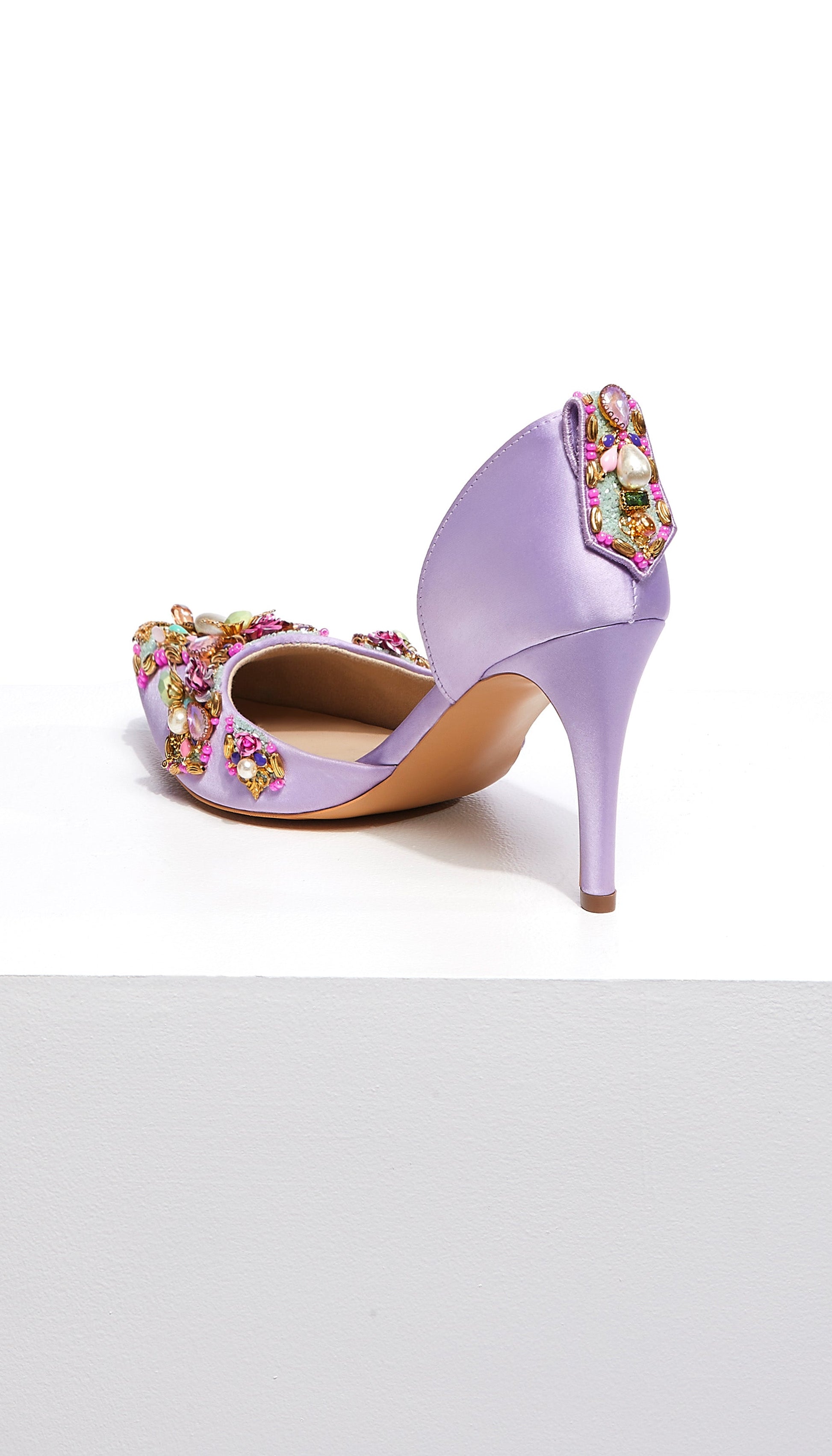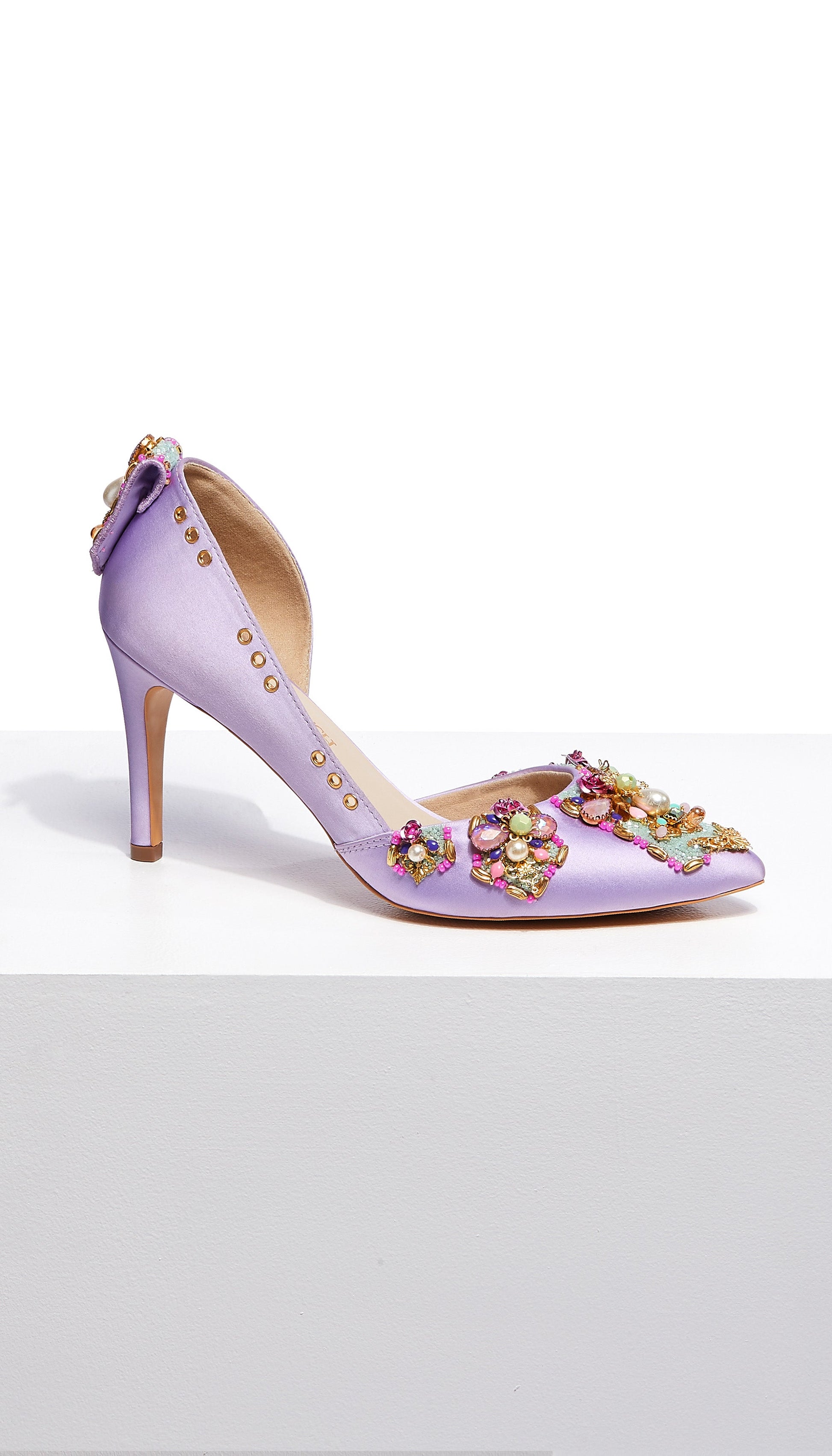 Featuring a classic Lilac pump on a 3.5-inch stiletto, Very peri pumps are our personal favorites. It comes with a delicate topline and is hand embellished using custom-made roses, crystal stones, Swarovski pearls, and metal charms.