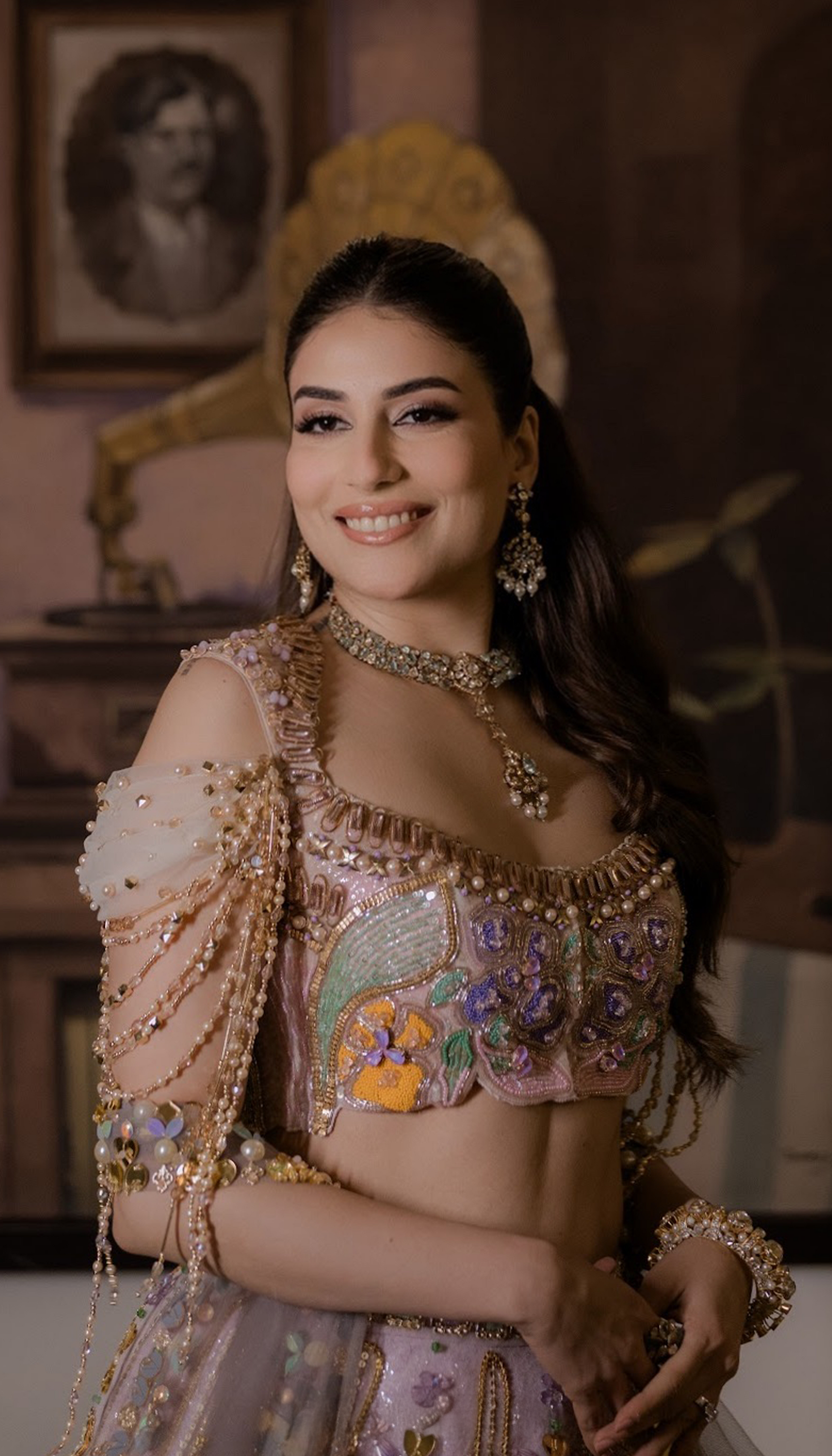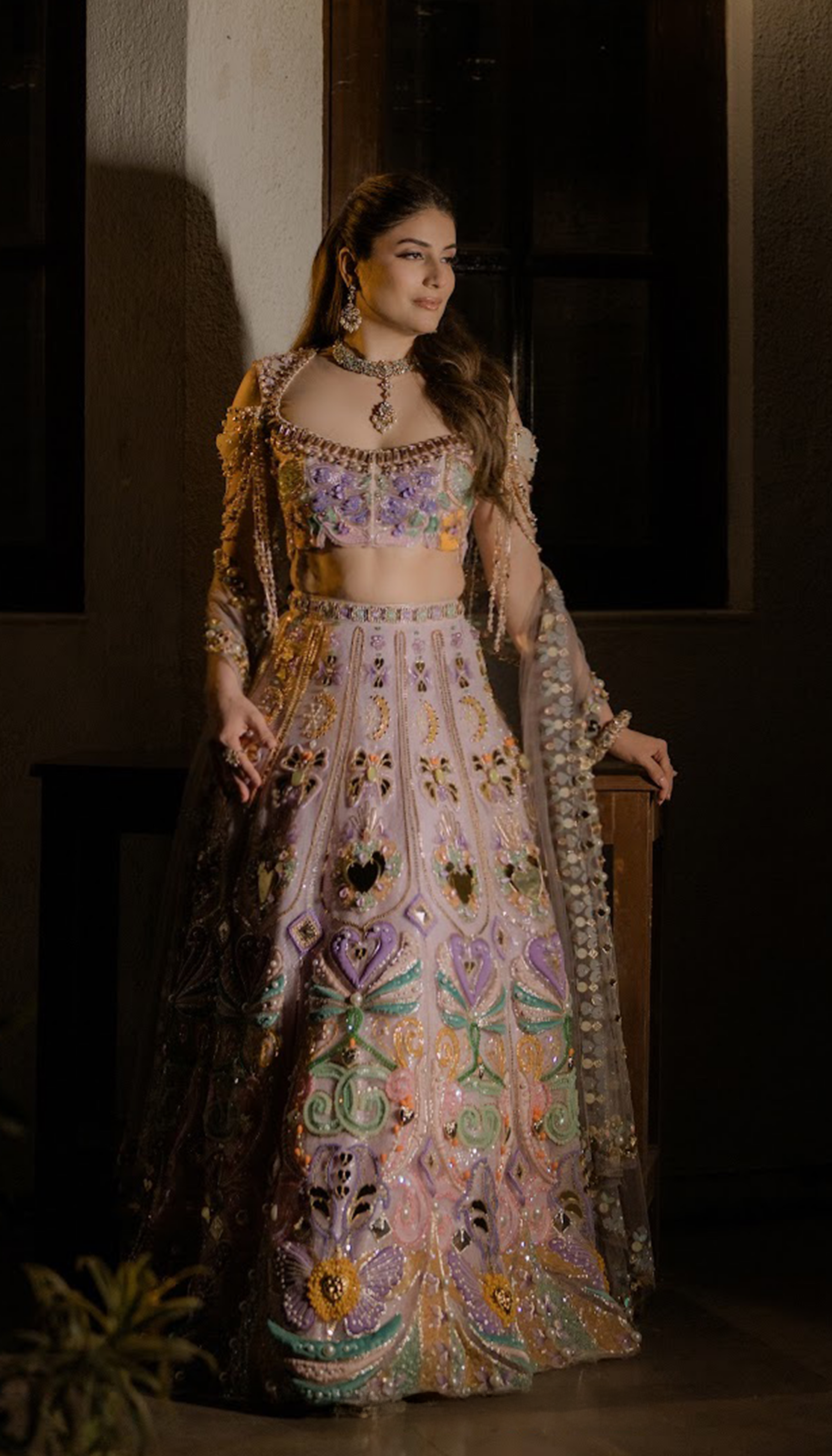 Our baby pink lehenga set is rendered in delicate shades of lilac, mint, peach, and gold, richly embellished with intricate beadwork, metal accents, pearls, sequins, and appliqué motifs with a delicate blouse featuring 3D detailing and soft beaded fringes, adding movement and charm. Radiant yet whimsical, this piece embodies modern femininity through a kaleidoscope of texture and tradition.