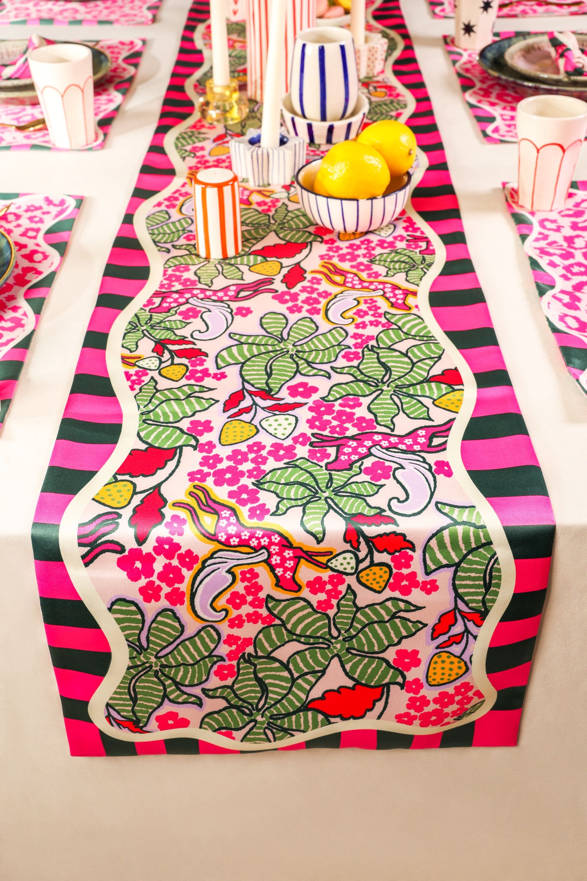 This hot pink satin table runner features a bold mix of tropical botanicals and cheetah, flowing through a soft, wavy silhouette. The playful pink background with olive green stripes adds a striking contrast, making it a perfect statement piece for modern, eclectic spaces.